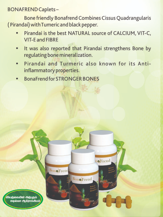 Therefore Pirandai, becomes the best source of natural Calcium , Vitamin C with the unique ingredient Phytoestrogen makes BonaFrend the RIGHT and the BEST bone friendly Herbal supplement.